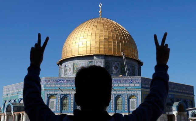 A Palestinian youth flashes the V for victory sign during Friday prayers in front of the Dome of the Rock at the Al-Aqsa Complex in Jerusalem's old city, Dec. 8, 2017.
